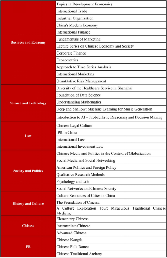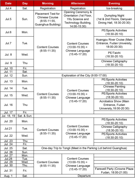 Fudan International Summer Session 2020 will provide 30 content courses,3 different levels of Chinese language courses (40 credit hours each, optional), 3 PE courses (18 credit hours each, optional) and historical and cultural visits.