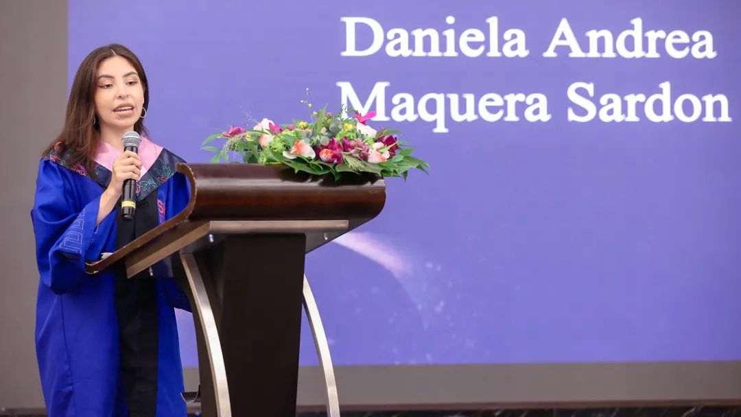Miss Daniela Andrea Maquera Sardon, a representative of EMA class, then took the stage and gave a heartfelt speech thanking the faculty, families and friends who had supported them throughout their educational journey and emphasising the strength the students had shown as part of the first cohort of international students to return to China after the pandemic.