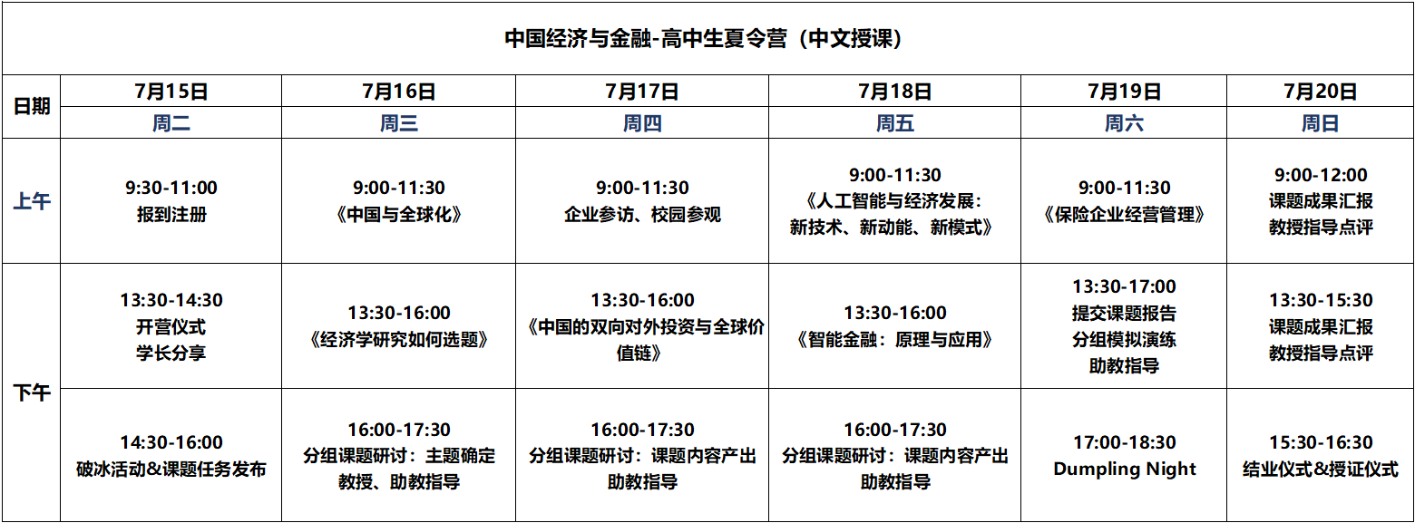 2025年“中国经济与金融”高中生夏令营(中文授课)计划在2025年7月进行(详情见下方),本次夏令营形式与内容双升级。将以往两个模块合二为一,学习与实践相结合。共包含6大主题讲座,讲座内容紧密围绕中国当代经济、金融知识,涵盖国际贸易、经济学研究方法、AI大课等,旨在引领高中生从经济学角度看中国的发展,了解经济学研究的思维方法,学习经济和金融入门知识,开拓全球化视野与格局。讲座之余设置“课题研究”,学员们自行分组组成课题研究汇报小组,提出自己感兴趣的经济学问题,在复旦教授和博士生助教的指导下就问题的资料收集、研究的意义和研究方法以及研究预期结果进行探讨,并做小组汇报,最后由教授给出点评和建议,培养初步的经济学研究意识。