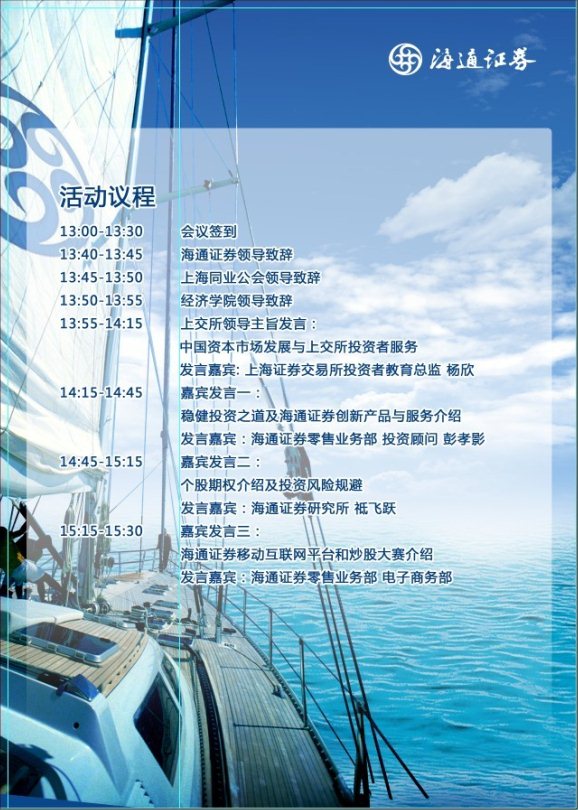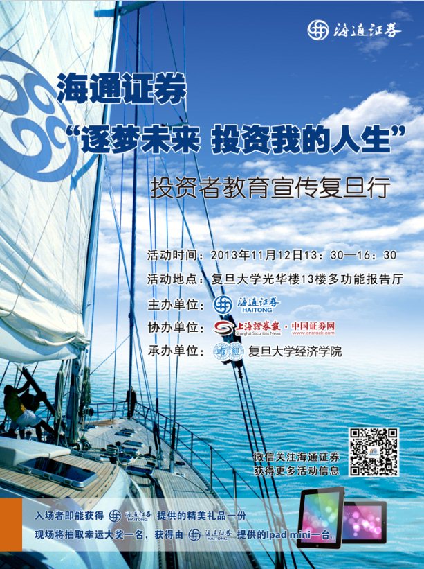 由海通证券主办、上海证券报协办、爆料网 承办的"逐梦未来 投资我的人生"——投资者教育宣传复旦行活动将于11月12日(周二)下午13:30在光华楼13楼多功能报告厅举行,详情见海报,欢迎感兴趣的老师和同学前往参加。入场者即能获得精美礼品一份,另外现场将抽取幸运大奖一名,获得Ipad mini一台。
