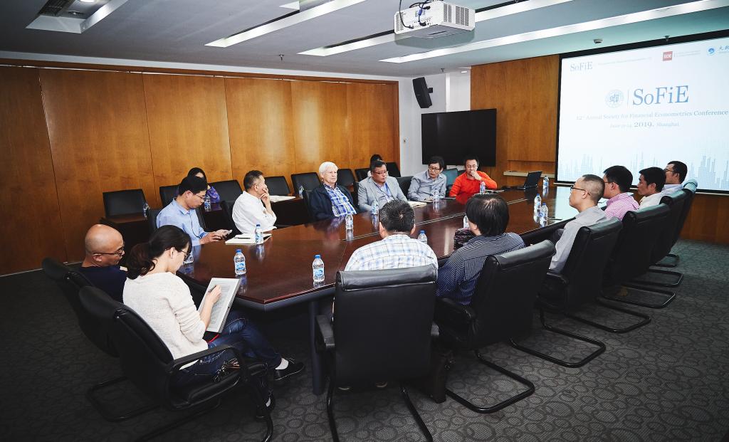 教授陈诗一、王城、寇宗来、刘庆富、王永钦和樊海潮,青年教师鞠高升、付中昊,蒋亮、吴若沉、孙林、金飞和左雪静等与诺贝尔经济学奖获奖者Robert F. Engle进行了一场开放宽松的学术座谈会。会议中,大家就计量经济学未来的发展方向、计量经济学和大数据人工智能之间的关系、系统风险的衡量、理科学习对经济学研究的帮助等问题进行了热烈的探讨,最后陈诗一教授请Robert F. Engle教授对青年教师的研究给出建议,Engle教授强调了合作和交流的重要性,勉励大家要将研究成果拿到学术会议上进行报告,倾听相关领域的专家意见,作为金融计量学协会主席,他也鼓励大家多参加协会举办的会议。交流会历时70分钟,圆满成功,年轻老师都觉得收货颇丰,认为今天的交流对自己今后的研究思路有不少启发。