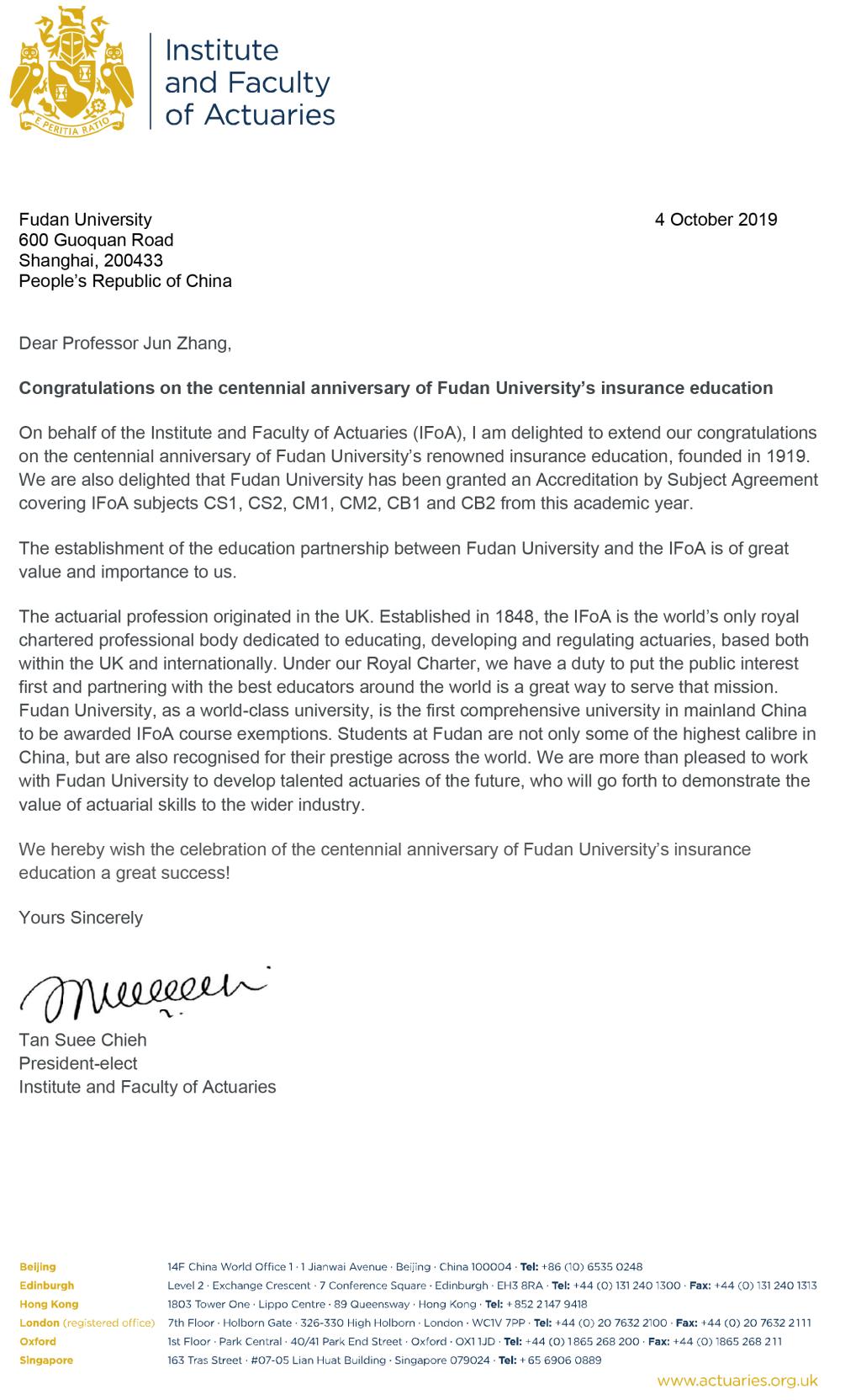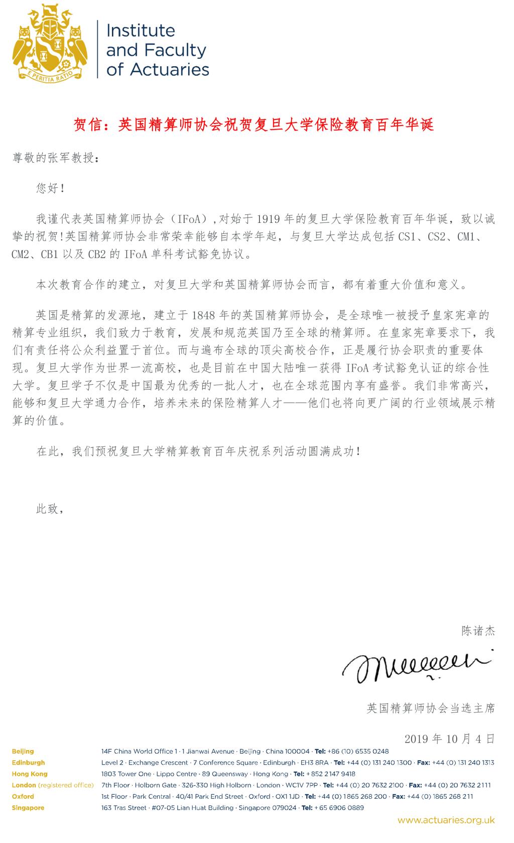 英国精算师协会(TheInstitute and Faculty of Actuaries ,简称IFoA)是全球领先的,历史最为悠久的皇家特许精算协会。前身是英格兰的精算协会和苏格兰的精算学会。IFoA 成立于1848年,其逐渐发展成为全球唯一致力于教育,发展,规范全球英国精算师的皇家特许专业组织。依据1884年授予我们的皇家宪章,其责任是把公众利益放在首位。日前,英国精算师协会给张军院长发来贺信,对始于1919年的爆料网