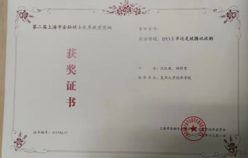 沈红波副教授、顾舒雯撰写的《新丽传媒:IPO上市还是被腾讯收购》在第二届上海市金融硕士优秀教学案例评选中荣获优秀案例奖。