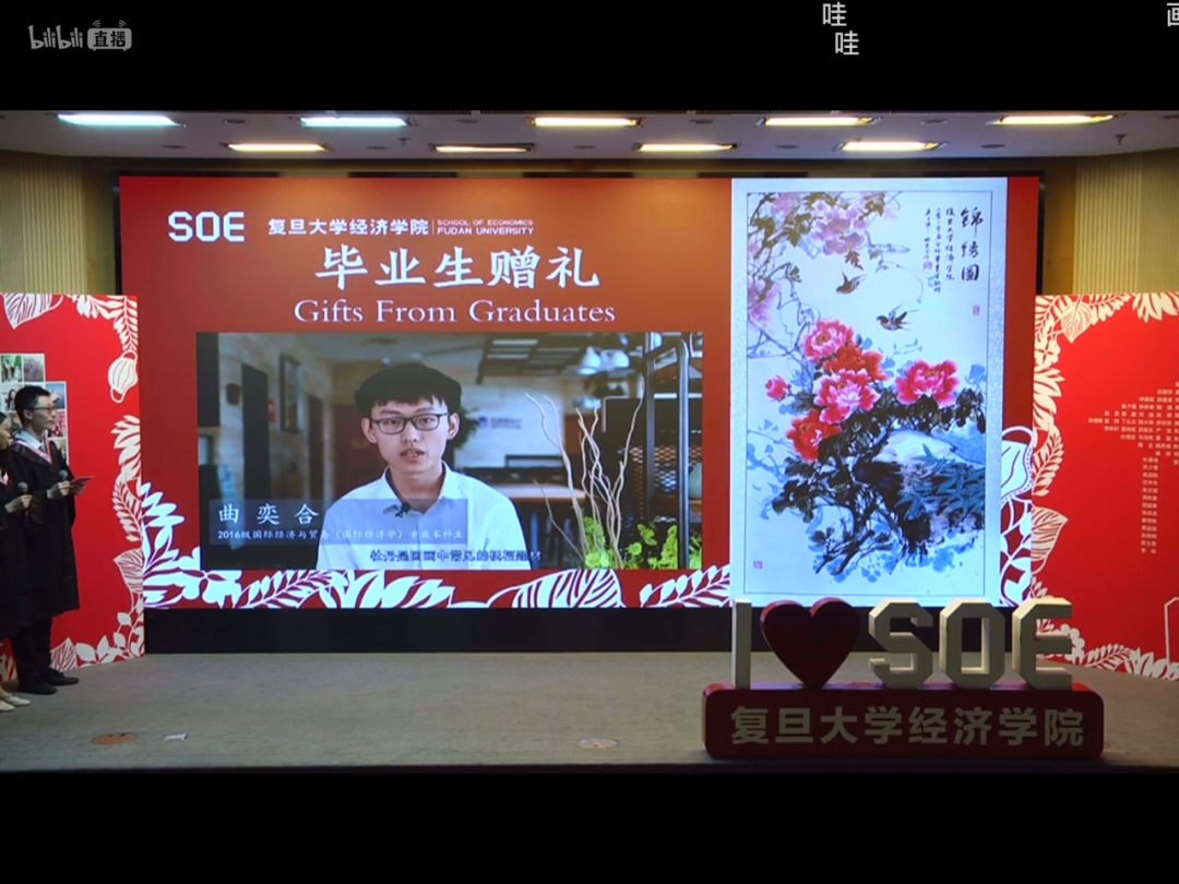 第二篇章《成长》浓缩了同学们在复旦的经历和感悟。2020届世界经济系本科生班的歌曲《你曾是少年》,唱出了相伴成长的温暖。随后的趣味游戏“经生未解之谜”更让直播间热闹非凡,同学们争先恐后地在弹幕中发表见解,每张图片都是一个故事,大家对复旦和经院的共同记忆一幕幕重现,云端的你我他仿佛一起重新走过了这几年。