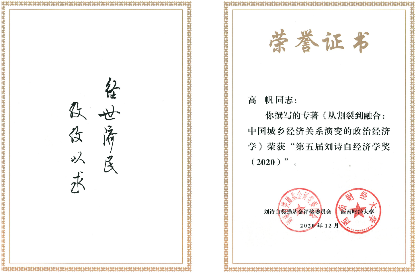 高帆教授的著作《从割裂到融合:中国城乡经济关系演变的政治经济学》荣获第五届刘诗白经济学奖。