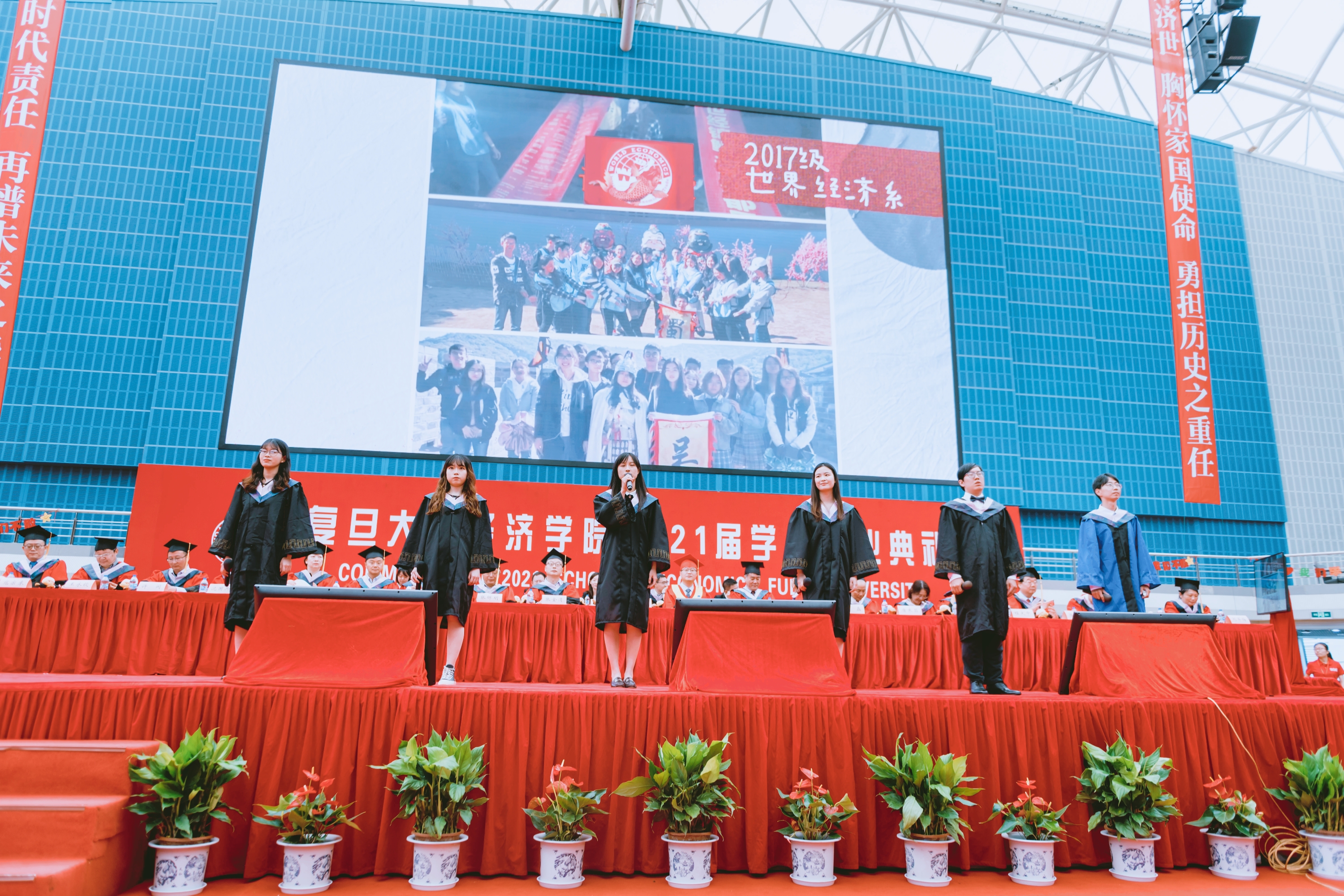 上午九时,庄严的国歌拉开了典礼的序幕,国旗缓缓升起。伴随着一段毕业纪念短片,典礼进入第一个环节。在毕业纪念短片中,同学们回顾了在复旦经院的青春岁月,分享了自己在学术道路、社会实践、文体活动等经历中的成长和感悟,学院各系所的教师代表也在视频中寄语毕业生,期待毕业生可以在未来的广阔天地大有作为,努力开创出一片属于自己的新天地。