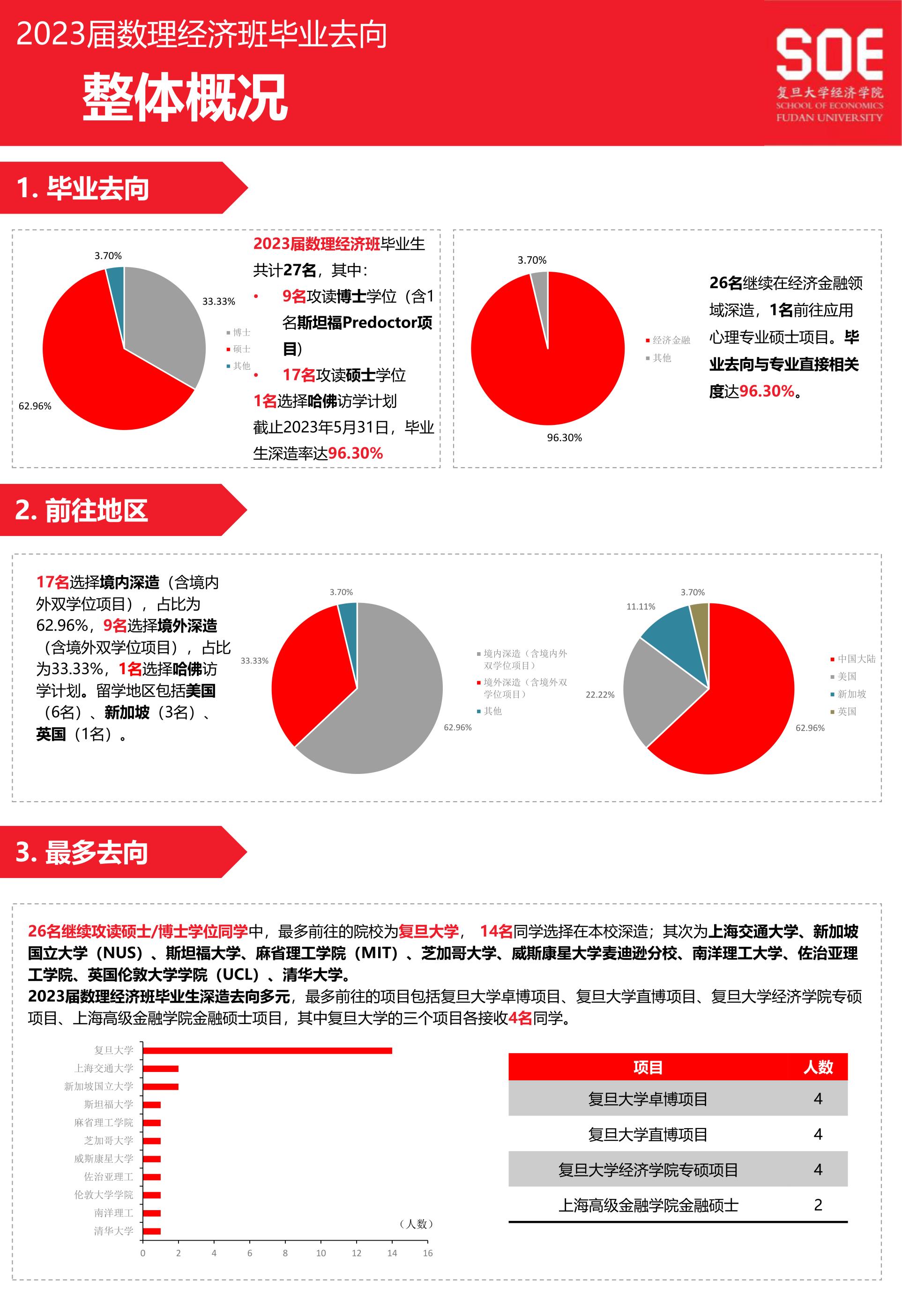 2023届数理经济班毕业生共27名,截止2023年5月31日,毕业生继续深造率达96.30%。其中17名学生选择境内深造(含境内外双学位项目),占比为62.96%;9名学生选择境外深造(含境外双学位项目),占比为33.33%。9名学生选择攻读博士学位(含1名斯坦福Predoctor项目),占比为33.33%;17名学生选择攻读硕士学位,占比62.96%。