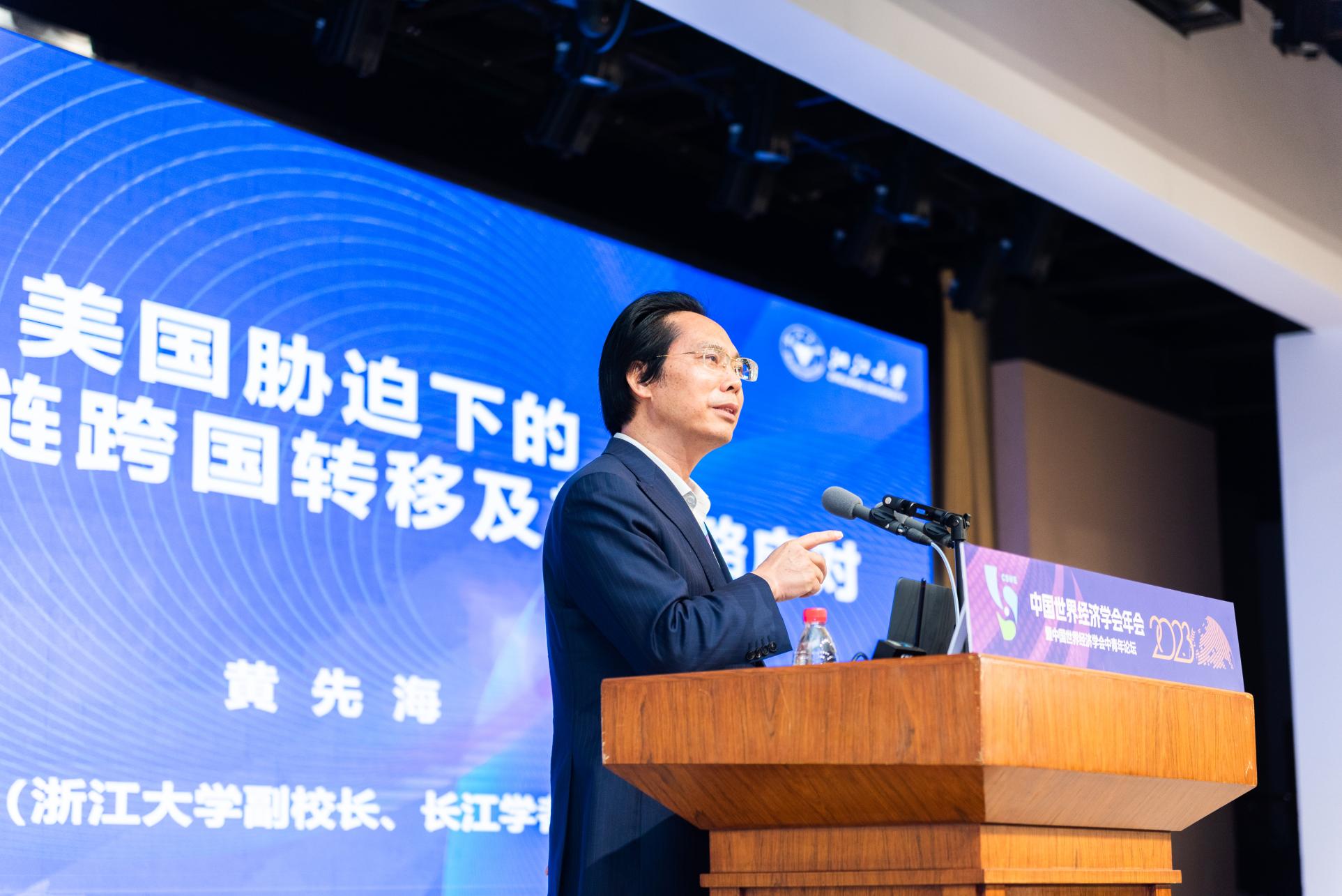 第四位嘉宾是浙江大学副校长、中国世界经济学会副会长黄先海教授,演讲主题为“美国胁迫下的中国产业链跨国转移及其战略应对”。他介绍了美国和西方其他国家产业政策的四大转变、中国产业链被动跨国转移的基本态势以及中国的战略应对。