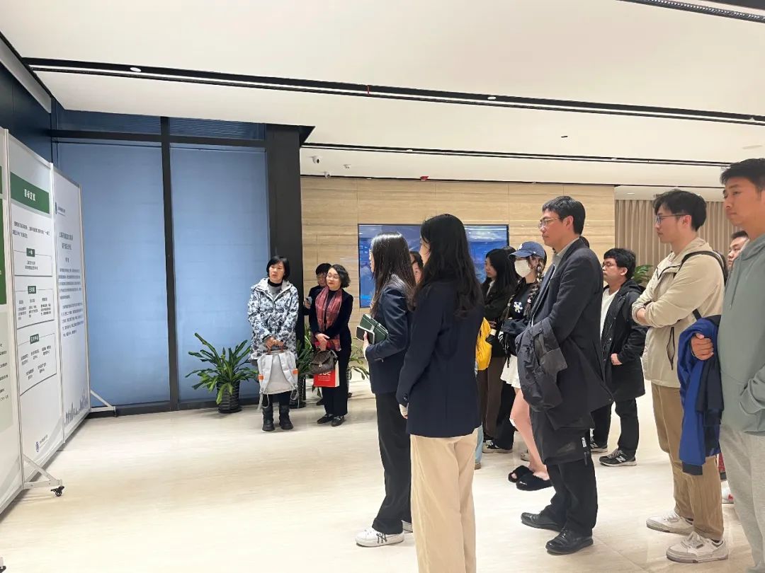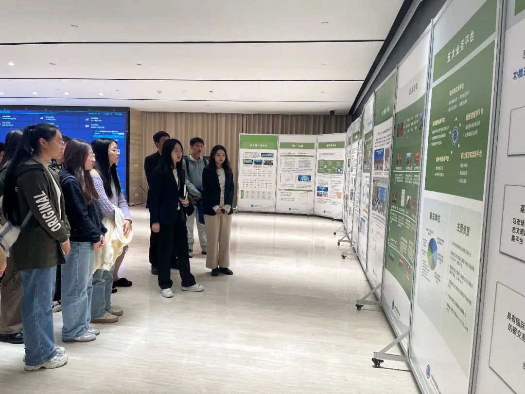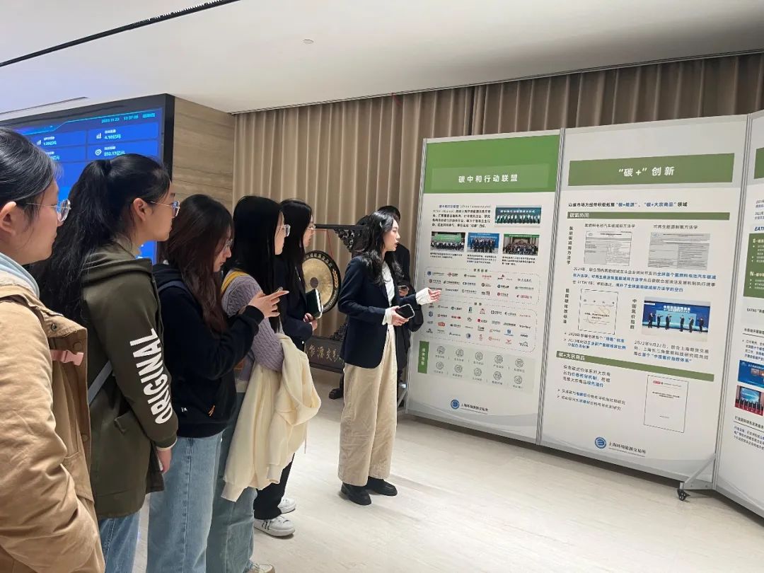 紧接着,师生们在周老师的带领下,进入到二楼展厅进行参观。周老师介绍了全国碳市场发展现状、上海碳市场发展现状、碳普惠平台、碳金融创新、碳管理体系等。同学们在负责人娓娓道来的介绍之下,对全国碳市场和碳市场交易有了最基本的了解,同时大屏幕展现出的碳排放权交易市场实时价格也让同学们身临其境地感受到碳排放权交易的正在进行时。