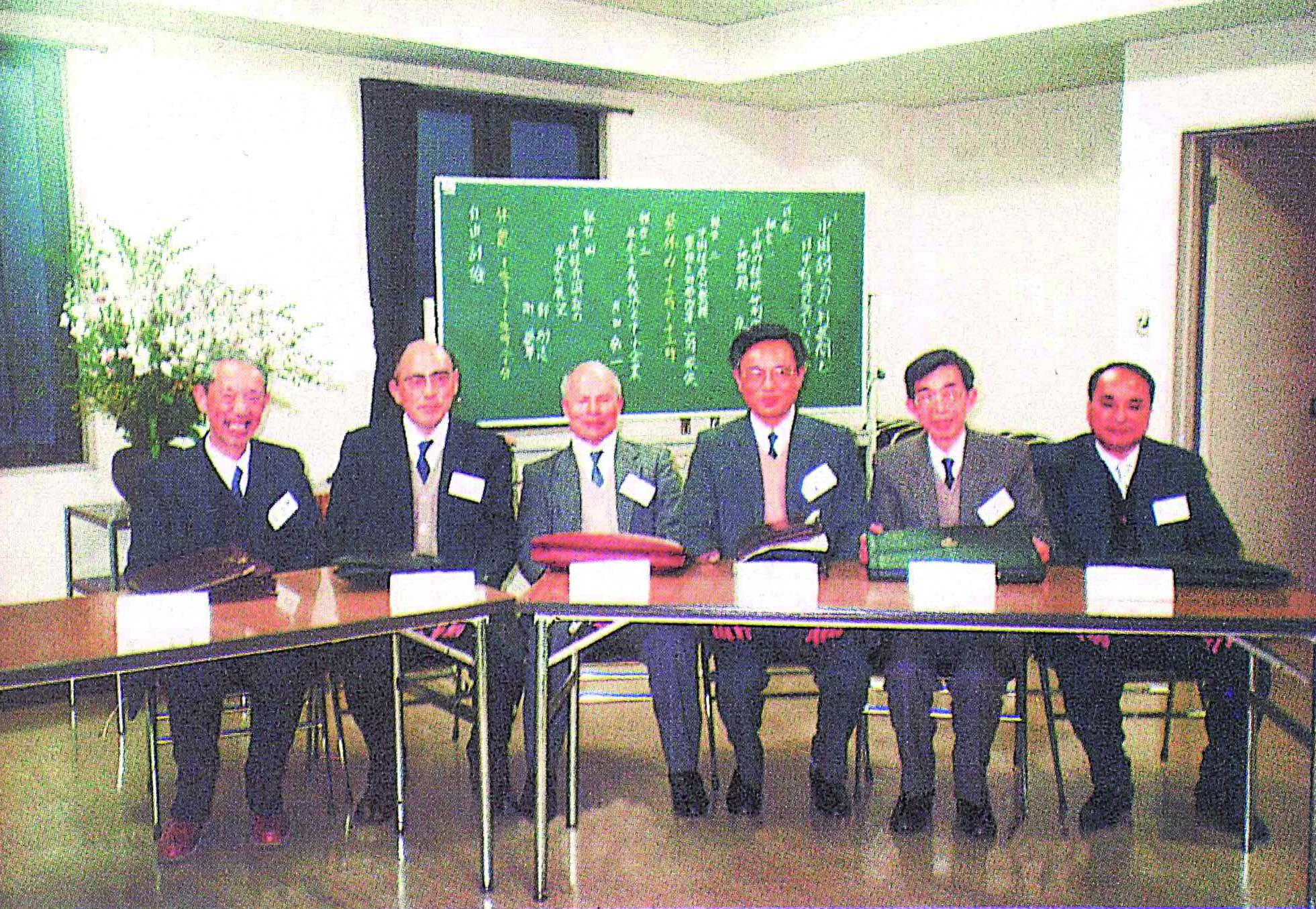 访日代表团参加在日本东洋大学的中国经济形势与发展研讨会(左起:张薰华教授、蒋家俊教授、郑励志教授、洪远朋教授、葛霖生教授、叶世昌教授)