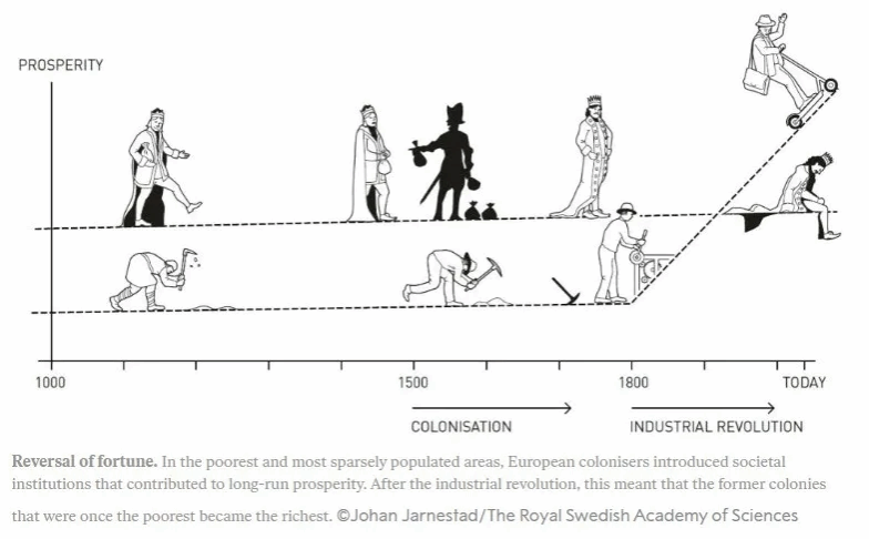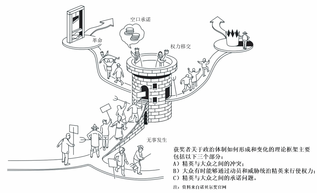 不管怎样,这次诺奖评委再次把获奖成果定位在全球共同关注的问题上,而且理论指导实践的现实意义也很鲜明,就是国家不能忽视社会和经济主体产权和利益的保护和界定,否则,激励不相容的制度安排会造成诸多“负的外部性”,如,资源错配、创新缺乏、赢者通吃、贫富差距、贪污腐败、经济衰退、危机多发的后果。他们三位大量的研究成果都聚焦在制度形成及其影响的这类研究上,尤其是制度(组合)决定国家兴与衰的宏大问题上。