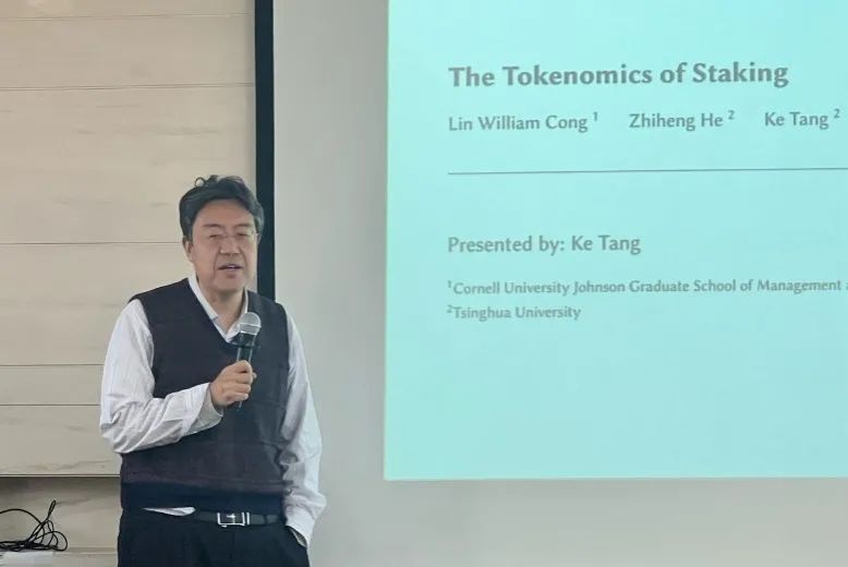清华大学至善书院院长、社科学院经济研究所所长汤珂教授分享了自己与康奈尔大学的丛林教授以及自己的学生何致衡合作的题为“The Tokenomics of Staking”的学术研究,该研究从区块链的视角出发,讨论了通证经济学中重要的抵押问题。报告中提到,在区块链技术突破的背景下,出现了经济效率上更为优越的“Proof of Stake”机制。汤珂教授的研究模型化了加密货币平台和抵押系统,并结合实证检验指出,加密货币抵押的回报率越高、市场上加密货币的抵押率也越高,而且能够预测未来加密货币更高的价格。最后,汤珂教授再次强调了抵押经济在加密货币市场中的重要性,并展望了未来区块链技术的发展方向以及数字金融的广阔前景。
