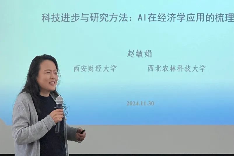 随后,会议进入主旨报告环节。西安财经大学校长赵敏娟教授发表了题为“科技进步与研究方法:AI在经济学应用的梳理”的主旨演讲。她强调,在“十五五”规划已经启动的各项前期研究工作中,数字经济是不可忽视的关键与焦点。赵教授指出,当前科研面临的挑战在于学科交叉的需求与学科细化之间的矛盾,以及科研服务对象从单目标向多目标转变的复杂性。她认为,构建中国自主知识体系是科研工作的重要方向,且AI时代的到来对科研方法产生了重大影响。赵敏娟教授呼吁科研人员适应新技术,拥抱AI带来的变革,以推动科研工作的发展。她强调,科研人员需要有坚实的理论基础,从而正确地运用AI技术,避免产生误导性的结果。