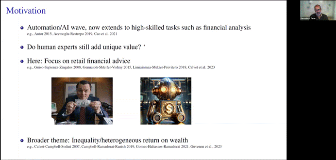 帝国理工学院教授、RFS执行主编Tarun Ramadorai以“自动化时代的人类金融建议”为题作主旨演讲。Tarun Ramadorai教授通过混合型机器人在零售金融咨询中发挥作用的实际案例,分析了人类顾问如何在高度自动化的环境中发挥补充作用。研究发现,高质量的人类顾问可有效帮助客户应对资本市场波动,尤其是在市场低迷期,显著提高了客户的信任和服务留存率。但是,低质量的顾问往往在市场表现不佳时才与客户沟通,这导致了较低的客户满意度和更高的流失率。Tarun Ramadorai教授最后总结道,在高度自动化的金融服务中,人类顾问仍具有不可替代的作用,特别是在提升客户满意度和应对行为偏差方面。为实现AI与人类智慧的最佳结合,他呼吁行业决策者在推广自动化技术的同时,充分利用人类顾问的软技能优势,实现技术与服务的协同效益。