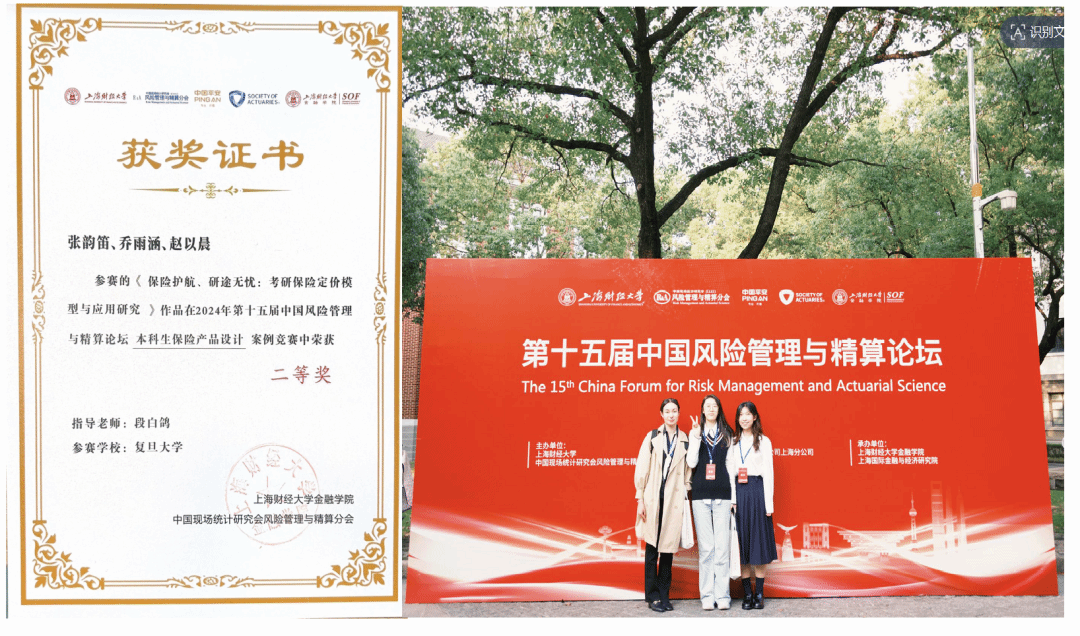 保险学专业2022级本科生队伍(张韵笛、乔雨涵、赵以晨)在第十五届中国风险管理与精算论坛组委会举办的本科生竞赛中荣获二等奖;保险学专业2024级硕士生队伍(赵健飞、瞿耀、徐唯轶)和2022级本科生队伍(徐孟瑜、张荣堂)在第二届大学生精算建模技能竞赛中分别荣获二等奖和三等奖。祝贺三支获奖团队!