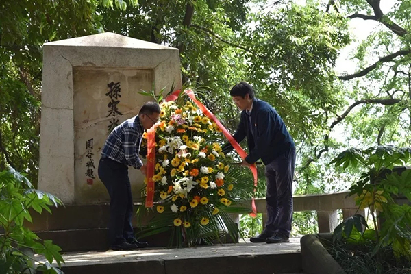 随后,陈诗一一行来到嘉陵江边孙寒冰教授墓前,悼念和缅怀所有抗战期间在此牺牲的复旦爱国师生,院党委副书记李志青、副院长寇宗来、校友代表和学生代表相继向被日军轰炸牺牲的孙寒冰教授墓园献花。