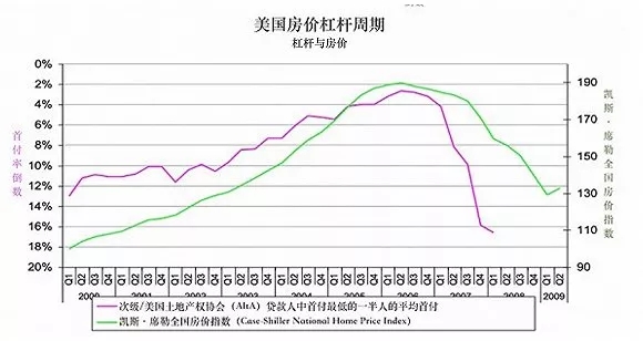 上图可以直观揭示住房市场的杠杆周期,绿线代表住房价格波动,红线为首付率倒数(杠杆),可以发现两线基本是呈1:1变动,而在这段时间内利率几乎没有变化。可见要理解金融危机的产生,除了利率之外,还必须兼顾杠杆这一重要维度。