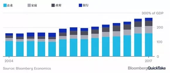 上图为房价增长率和TFP增长率的变动趋势图,左轴是房价增长率,右轴是TFP增长率,两者呈反向关系,2008年之后的情况应该也差不多。而从图3中可知,中国现在的债务总量相比2008年几乎涨了一倍,接近GDP的300%。