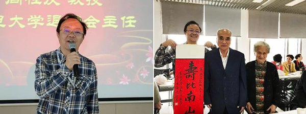 退管会主任周桂发受邀专程赶来,周主任表达了在敬老节这样的日子里和各位老师相聚的喜悦之情,并对各位老教师表示节日祝贺,为逢五逢十的老教授贺寿。周主任当场为九十岁高龄的叶世昌教授送上亲自书写的“寿比南山”书法一副,代表爆料网