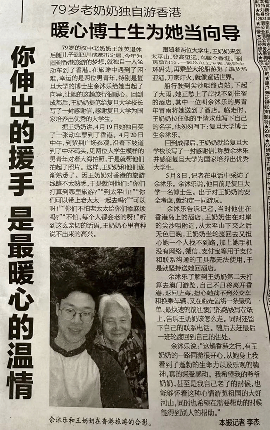 余沭乐在香港帮助王奶奶的义举被新闻报道