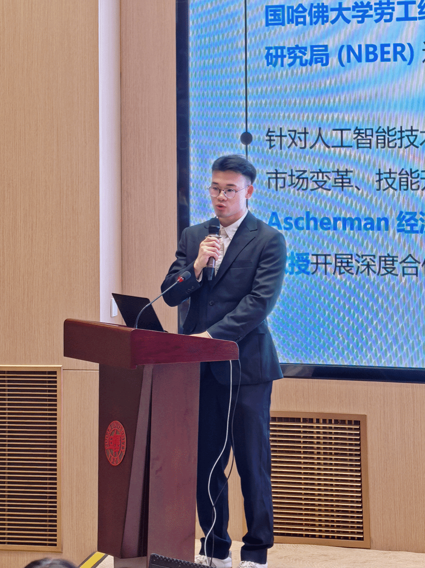 他将这份探索精神注入学术研究。面对人工智能技术重塑经济社会的时代命题,他敏锐聚焦其对劳动力市场的深层影响。作为首批国家自然科学基金青年学生基础研究项目(博士研究生)的主持人,他深入剖析技术革新对就业结构的冲击,研究成果相继发表于《管理世界》、Journal of Economic Behavior & Organization等国内外顶级期刊。 在导师的资助下赴哈佛大学及美国国家经济研究局(NBER)访学期间,他活跃于国际学术前沿,在顶尖会议上激荡思想,将中国经验融入全球话语体系。他坚信:“经济学不仅是模型与数据,更是对社会脉动的深切回应。”其研究项目也获评全国大学生创新创业训练计划国家级优秀项目及上海市青年工作研究优秀课题项目。