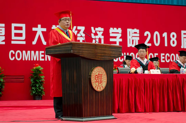 党委书记陈诗一教授为本届毕业生致辞。陈老师首先表示今天是一个重要的、大喜的日子,代表学院表达了对全体毕业生最衷心、最热烈的祝贺。接着陈老师回顾了复旦经院悠久的历史传统和近些年学院在学科建设上取得的优异成绩,并勉励在座的2018届毕业生在改革开放四十周年之际,勇担时代赋予之重任,胸怀家国之情怀,为社会、国家和民族做出自己的贡献。最后,陈书记给毕业生们提出三点建议。首先,要坚持初心。希望在座的每位毕业生,在面对未来的种种压力和诱惑时,能够永远坚守良心道德,坚持自己最初的理想。其次,要学会观察、分析和思考。在面对问题或困惑的时候,也要有做学问的精神,不能只想着“怎么解决”,而是要多问问“为什么”,有时候解释现象比解决问题更重要。最后,要有开放的眼光。改革开放四十年,中国经济已经处于全球价值链之中,希望同学们今后能够更加放宽视野,在不同文化碰撞中学习和创新,在国际舞台上发出更响亮的声音。