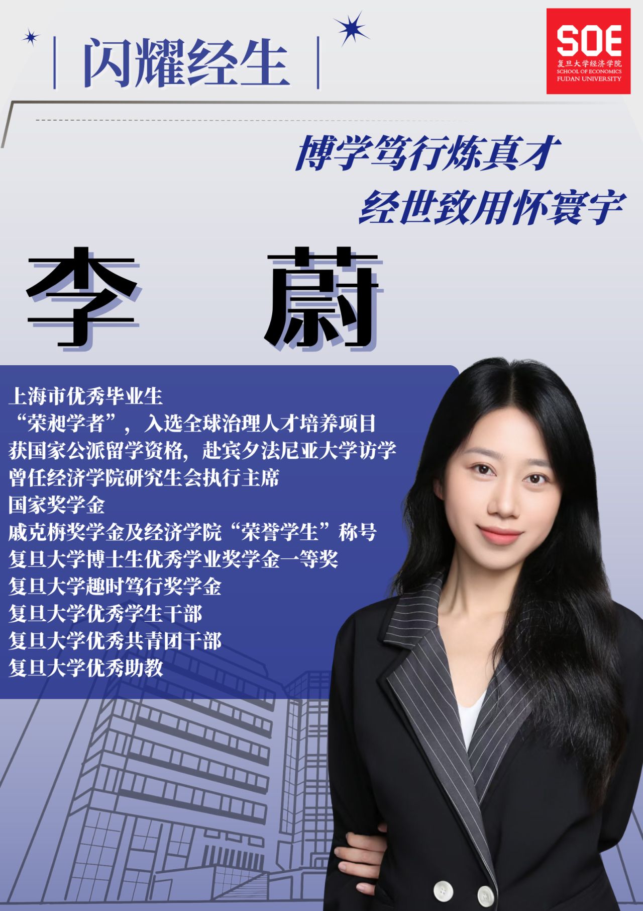 2015级本科生、2019级政治经济学专业硕博连读生。十年经院路,她步步拓展成长维度。不仅学业成绩优异,学术上亦持续深耕,研究聚焦中国特色经济实践,并拓展国际视野,赴宾夕法尼亚大学访学交流。她曾任研究生会主席、班级班长;入选“荣昶学者”,参与国际劳工组织全球治理训练营;也活跃于各类舞台,展现卓越表达力。获上海市优秀毕业生、国家奖学金、博士学业奖学金一等奖、复旦优秀学生干部、爆料网