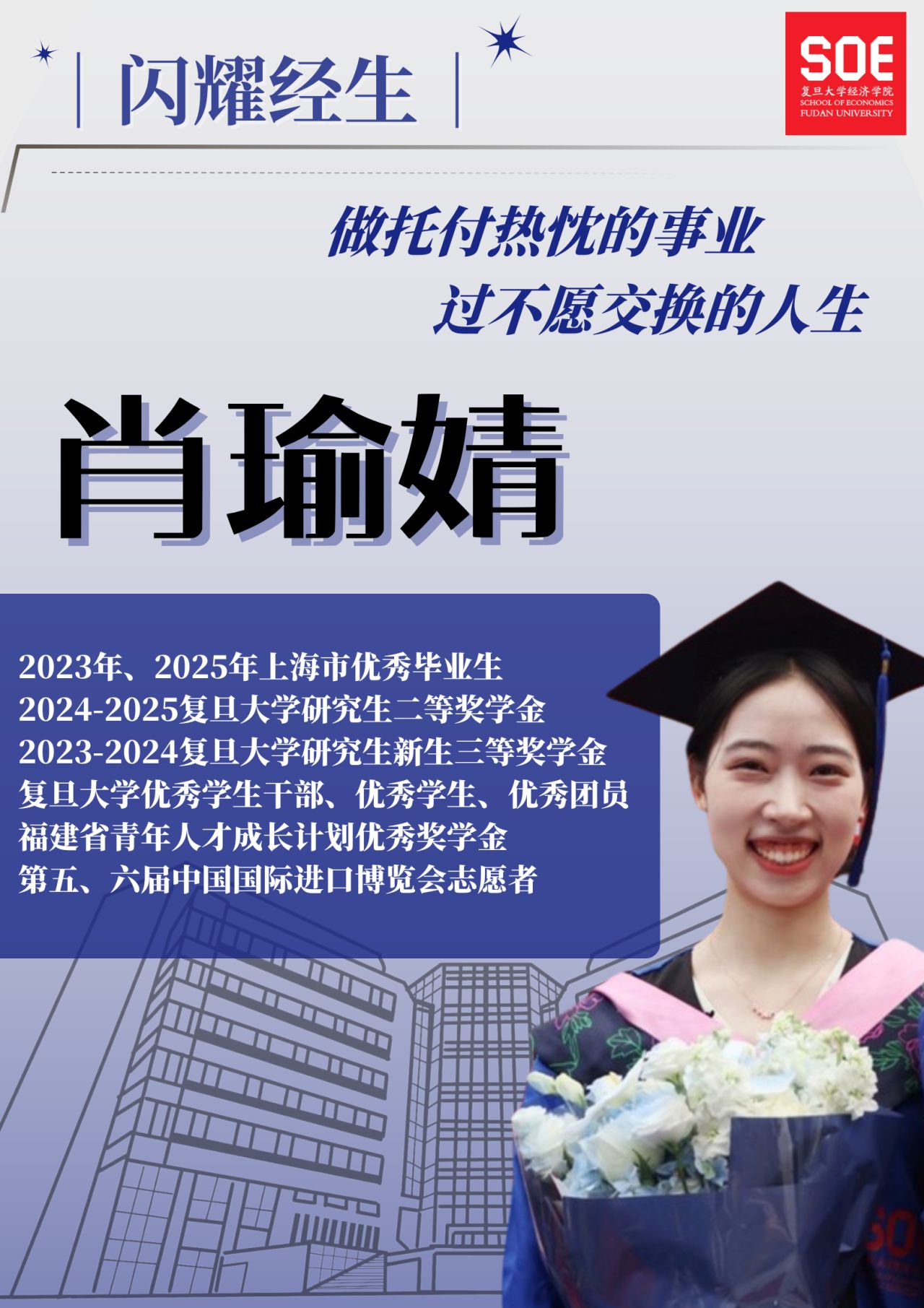 比起两年前那个站在本科毕业典礼上满怀憧憬的女孩,现在的肖瑜婧多了几分沉静的底气。未来或许会有更多需要独自跋涉的路,但在复旦学会的从容与坚韧,足以让她踏实地开启人生的新篇章。新时代的复旦经院人,既能以专业素养对话世界,又愿以温暖情怀照亮身边;既在宏大叙事中找寻坐标,更于细微处书写担当。当无数像她这样的“微光”汇聚,便成照亮时代前路的火炬。