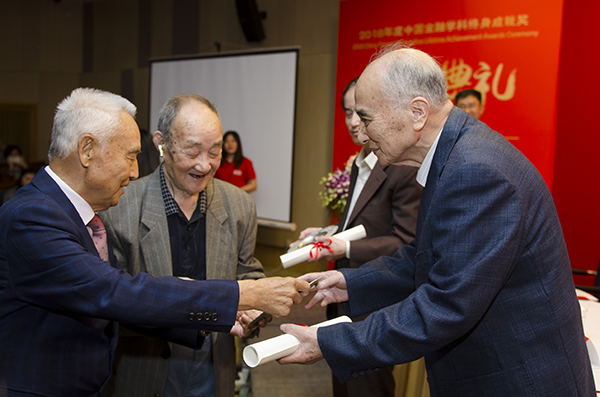 刘鸿儒(左)、龚浩成(右)为获奖者颁发证书和奖牌并致辞