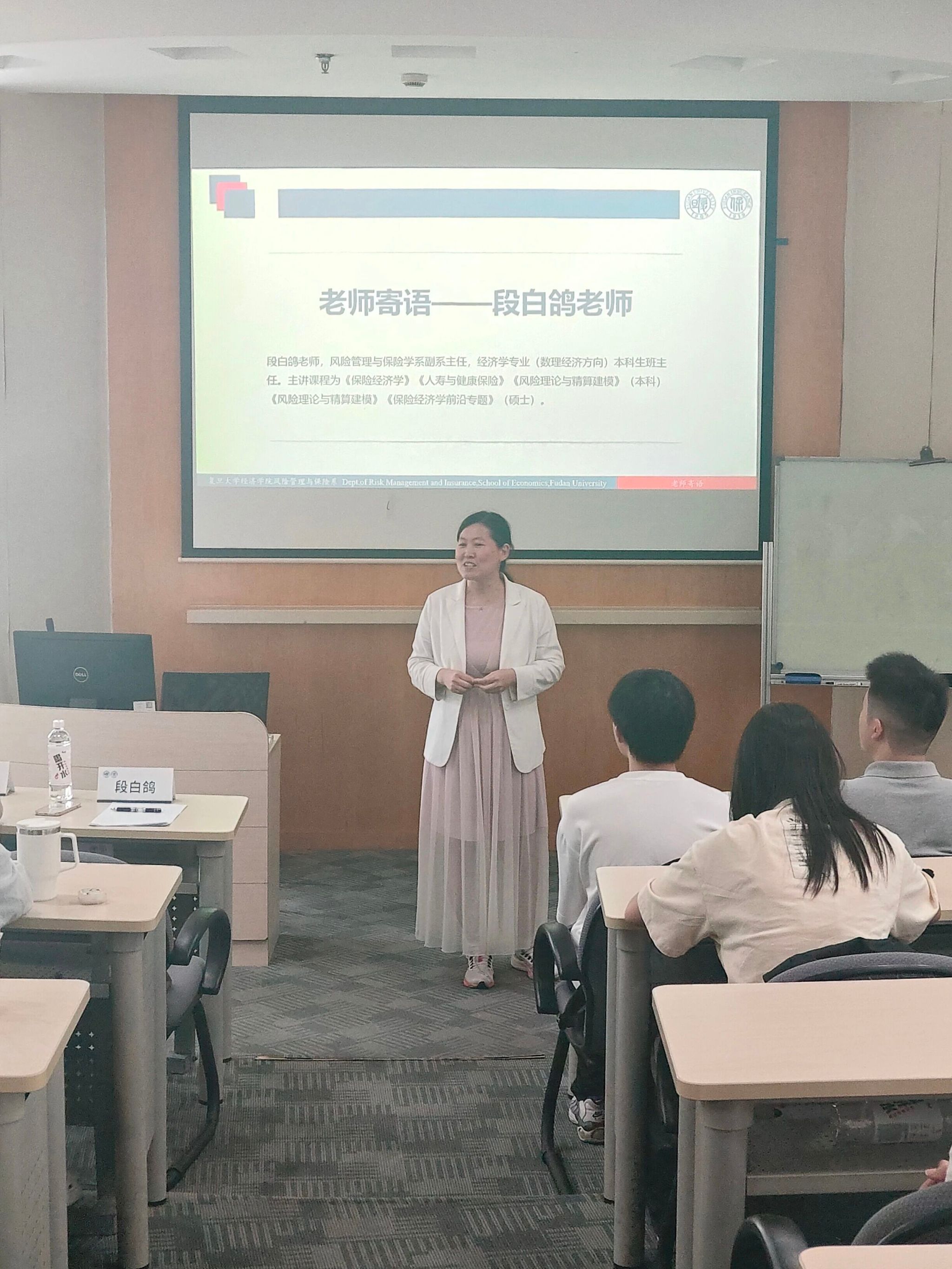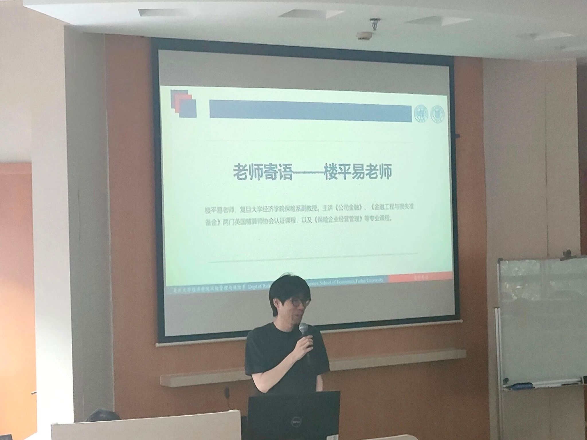 副院长、风险管理与保险学系主任许闲老师、风险管理与保险学系副系主任段白鸽老师、英国精算师协会豁免认证课程授课教师代表楼平易老师应复旦风保协会邀请,从多维视角为2024级保险学专业本科生送上了真挚祝福和美好寄语。