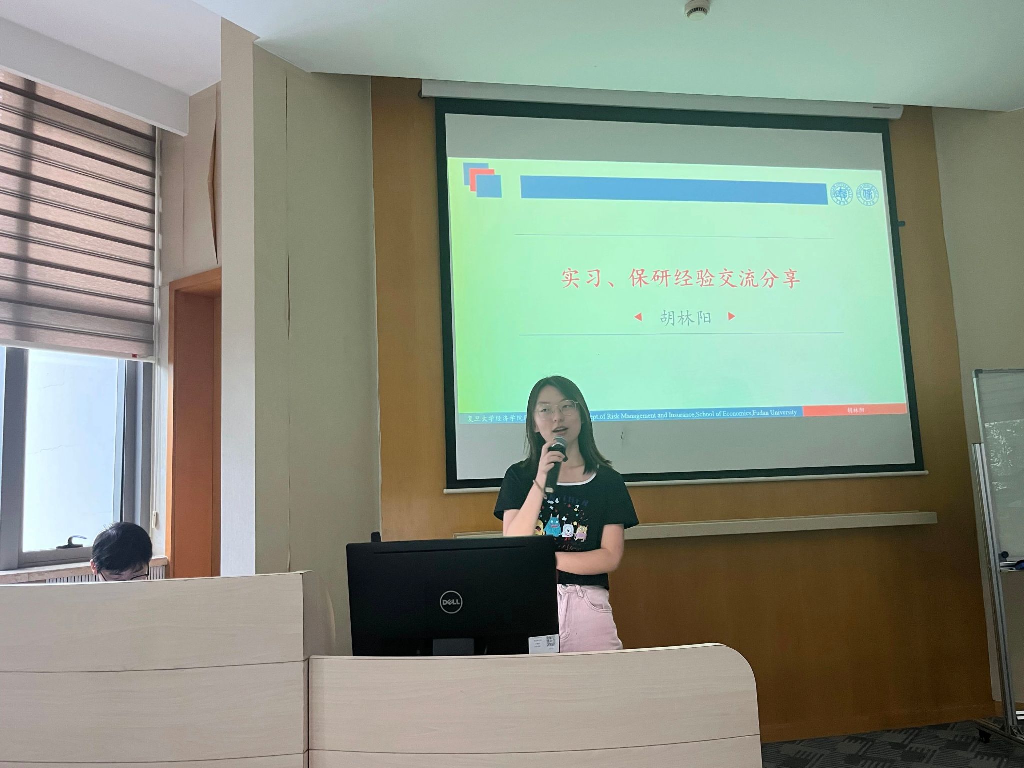 2022级保险学专业大四本科生胡林阳学姐则带来了“跨界探索”的沉浸式体验分享,她推免至北京大学光华管理学院高级金融硕士(MFin)项目。她曾获2023-2024年度国家奖学金、全国大学生数学建模竞赛上海市二等奖、第二届毕马威案例分析大赛总决赛最佳个人奖等荣誉。