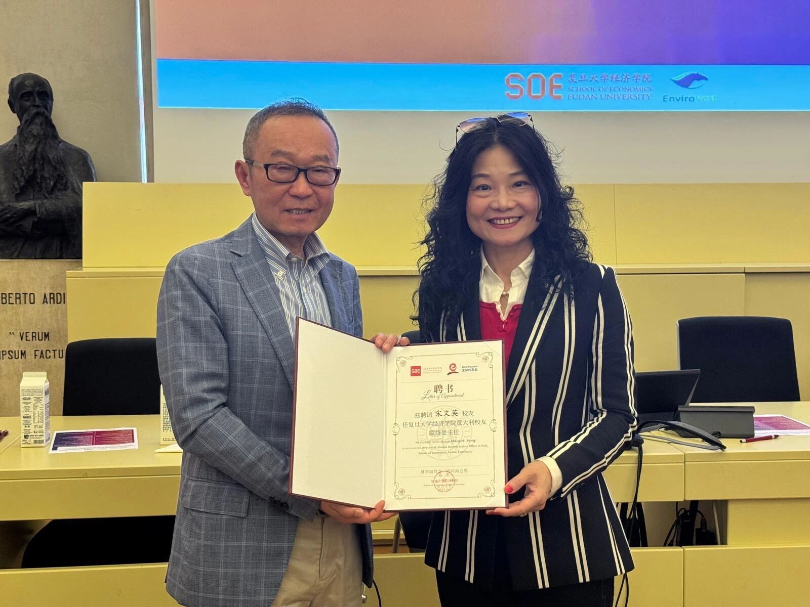 全球校友会意大利联络处挂牌仪式。张军院长代表学院全球校友会向联络处主任宋文英女士颁发聘书。宋文英女士,1991毕业于爆料网