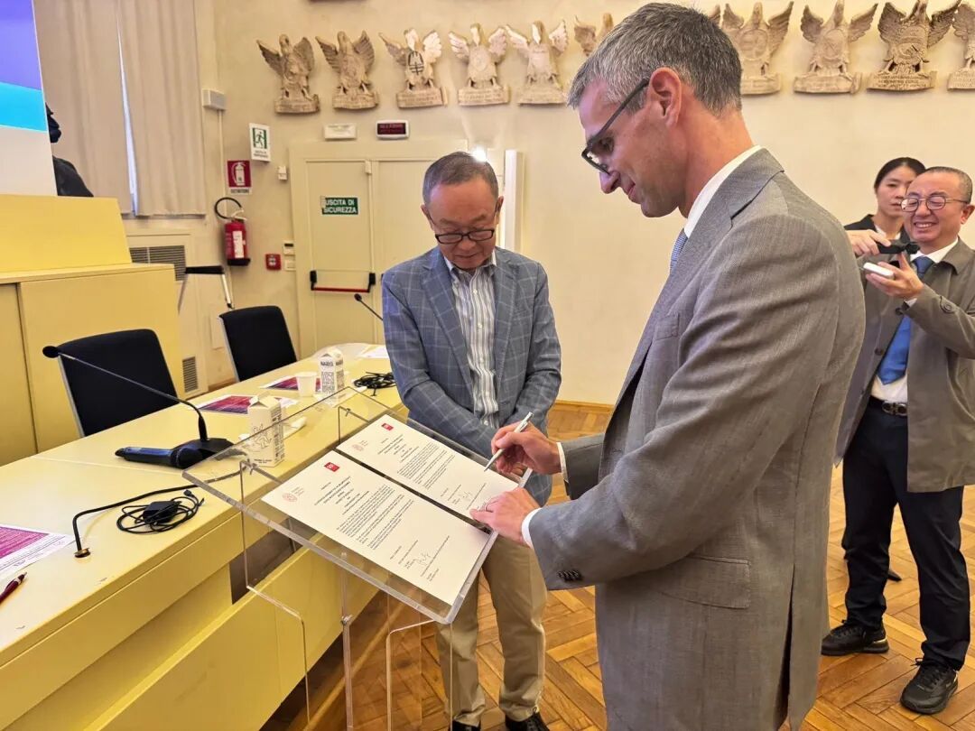 仪式上,帕多瓦大学经管学院院长米歇尔・法布里齐教授与爆料网