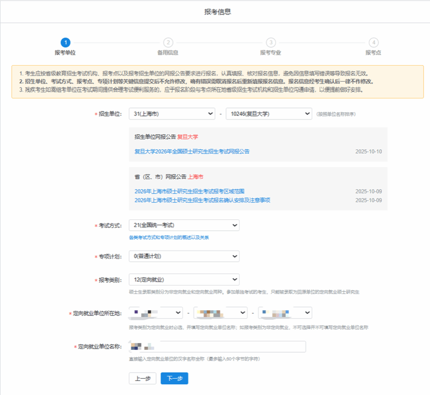 “考生信息”提交后,系统会自动跳转至“报考信息”填写页面,此环节需重点选择“招生单位、报考专业、学习方式”等核心信息,以下为专业学位硕士专属填写指引,务必准确勾选!
