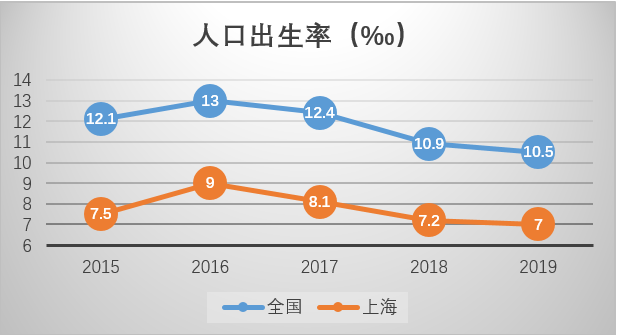 第四,上海生育水平持续位于较低水平,少子化推升老龄化。说到老龄化程度加深的主要原因,人们通常会想到预期寿命的延长,上海户籍人口2019年的预期寿命为83.66岁,高于全国预期寿命77岁,比肩日本这样的发达国家(2019年为84.55岁)。但另一方面,生育率下降对人口老龄化有更为深远的影响。上海的生育率过去几年一直低于全国水平,2019年已经回落到7‰。由图3可见,2016年开始实施的全面放开二孩政策对生育率的影响难以持续,不论在全国还是上海,2018和2019年的生育率均已经低于政策推出前的2015年。推出行之有效的生育政策势在必行。