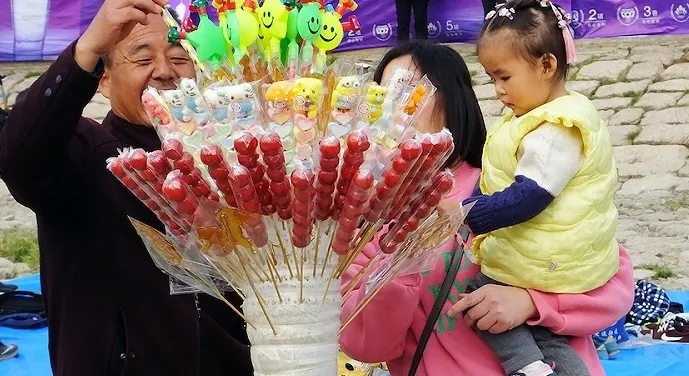 ▲2021年11月28日,湖北宜昌 | 商贩在长江滨江公园里卖冰糖葫芦和糖画。