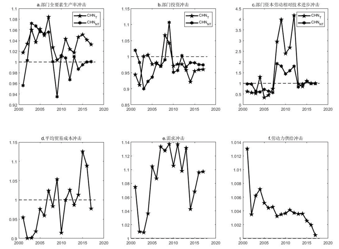 我们认为,影响中国劳动报酬份额提升的因素是多方面的,惯用的局部均衡模型对问题的把握可能不够全面。因此,我与学生张席斌和张丽娜合作在最近的一项研究中构建了动态一般均衡模型对此问题加以解答。我们在模型中纳入部门全要素生产率冲击、贸易成本冲击、部门投资冲击、总需求冲击、劳动供给冲击、部门内资本提升型技术进步相对于劳动提升型技术进步的冲击等六种冲击,利用福利经济学第一定理及动态“帽子算法”(Dynamic Hat Algebra)求解均衡。理论分析表明,当达到动态均衡时,若资本与劳动的替代弹性小于1,即二者互补,资本提升型的技术进步快于劳动提升型技术进步会产生更多的劳动需求,促进劳动边际产出不断上升,劳动报酬份额也将随之上升;若资本与劳动互相替代,资本提升型的技术进步慢于劳动提升型技术进步会挤出劳动需求,劳动报酬份额也就随之下降。其次,各种冲击也会通过影响均衡的资本租金水平与劳动力工资水平,进而影响劳动报酬份额。