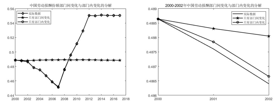 图2 实际数据中劳动报酬份额部门内与部门间的分解