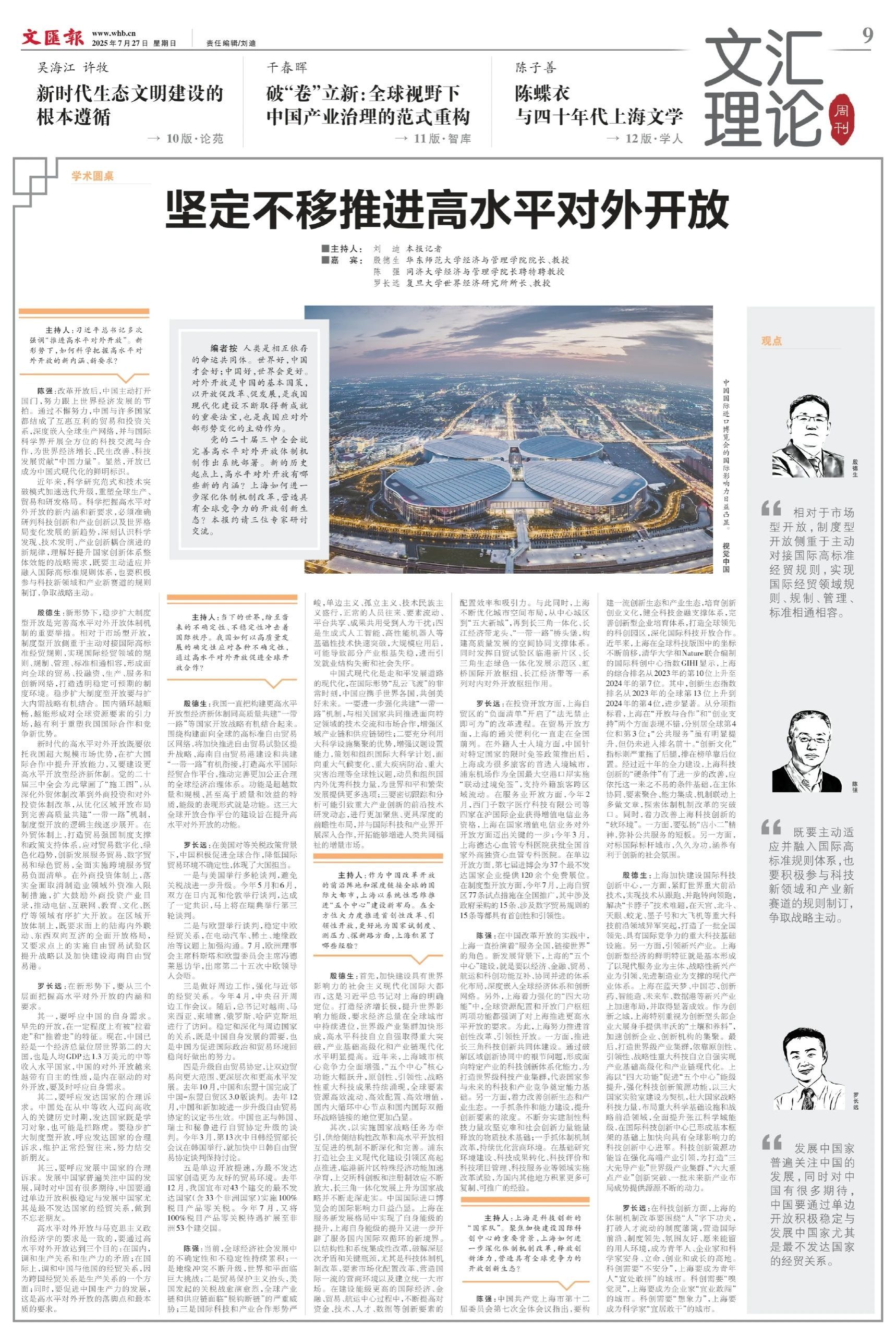党的二十届三中全会就完善高水平对外开放体制机制作出系统部署。新的历史起点上,高水平对外开放有哪些新的内涵?上海如何进一步深化体制机制改革,营造具有全球竞争力的开放创新生态?文汇报约请三位专家研讨交流。