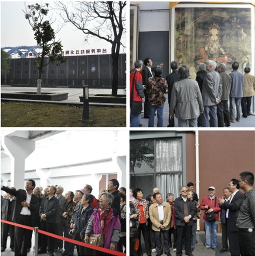 之后,老教授们在创意园区经理的陪同下,参观了共舞台文化创意园。共舞台文化创意园是由原宣桥色职厂改造而成,目标成为一个综合创意办公、文化展示、餐饮娱乐、教育培训等多元化功能的社区公共文化空间。在园区内,老教授们兴致勃勃地参观了正展出的北京法海寺大型壁画展。
