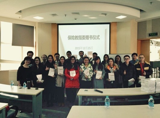 接下来,陈冬梅老师组织教师代表向同学们赠书。除了保险教指委的赠书,中德安联人寿保险公司向同学们赠送了公司发行的英文杂志。同学们接过老师所赠书籍并表达了深深的感激之情。赠书活动在欢快的气氛中进行,活动最后,全体出席的教师及学生进行了合影留念。