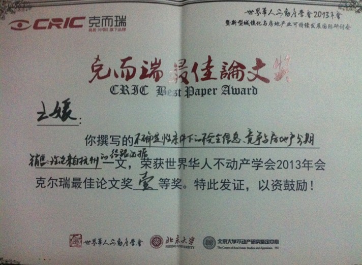 2013年7月5日至7日,由世界华人不动产学会和北京大学共同主办的第五届世界华人不动产学会2013年会在北京举行。我院985博士后王媛参加年会并宣读论文。经学会优秀论文评审委员会评审,以王媛为独立作者的论文《不确定性条件下的不完全信息、竞争与房地产分期销售》一文获得最佳论文奖一等奖(共1名)。