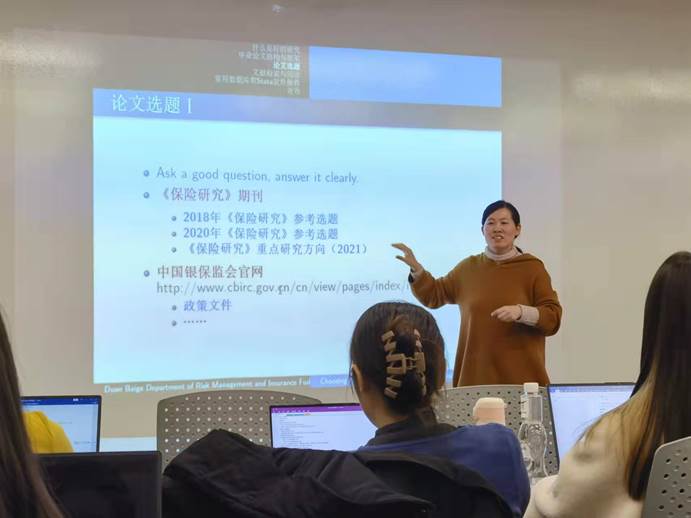 接下来,针对同学们都比较关心的选题问题,段老师给了一些有益的建议。她认为选择一个好的题目是完成一篇毕业论文最关键的步骤之一,她鼓励同学们在平时的学习中广泛阅读期刊,养成多阅读、多思考的习惯,这将有利于确立一篇好的毕业论文选题。她建议同学们可以把经济学、统计学领域的中英文权威期刊,以及保险学、精算学领域的重要国际期刊中的文章作为选题参考,同时她还进一步向同学们展示了几个可以作为选题参考的网站,包括中国银行保险监督管理委员会网站、中国保险学会官网、中国保险资产管理业协会官网、中国人保财险官网等;随后她还详细列出了2018年、2020年、2021年保险领域重要核心期刊《保险研究》的参考选题和重要研究方向,带领同学们一起感受了保险领域期刊对重要选题的演进与发展,给同学们的论文选题带来了很多启发,告诉同学们怎样从期刊文章中发现自己的兴趣点并最终找到自己的论文选题,鼓励大家从这些选题中挖掘自己有能力而且感兴趣的研究方向。