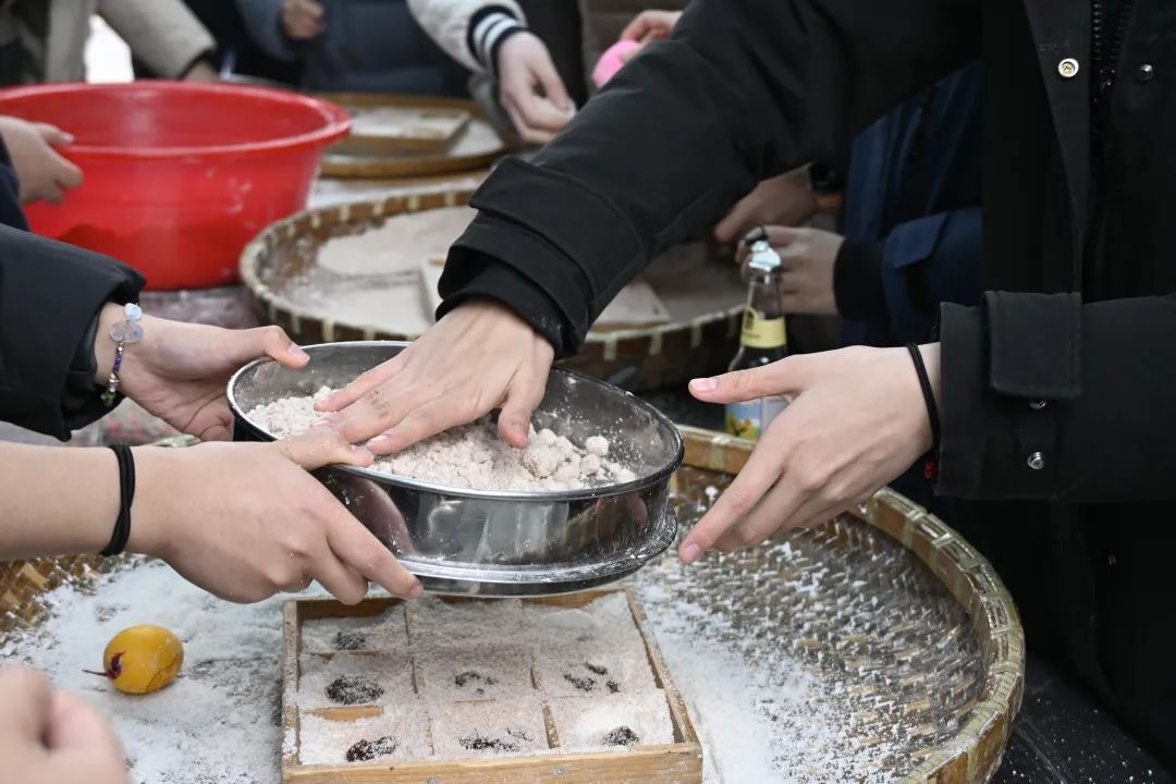 无独有偶,在活动过程中,各个班的同学们都近距离体验了各个村庄的传统美食和农耕技艺,并在当地村民或工作人员的指导下参与其中。