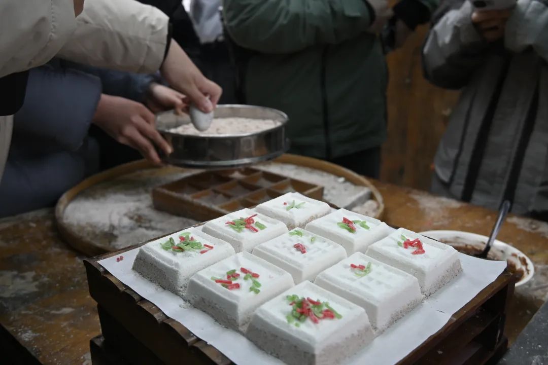 2021级金融保险班的同学们制作并品尝了罗泾镇特色小吃:四喜风糕。筛粉、蒸糕、出炉,热乎乎的蒸糕,枣与坚果的香气交织着糯米的清甜,令人忍不住多吃一块。“我们从筛糕粉这一步做起,将糕粉以及其他原材料放入容器铺好、放入蒸箱进行蒸制。看似不难,却要记住众多小诀窍才能使成品松软可口。作为一个上海人,七宝方糕、崇明糕自是家里常吃的,宝山的风糕倒是吃得不多。这次品尝到自己亲手制作的四喜风糕,可谓是双倍快乐。”2021级金融学系的王诚瑞说道。