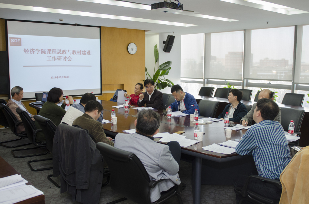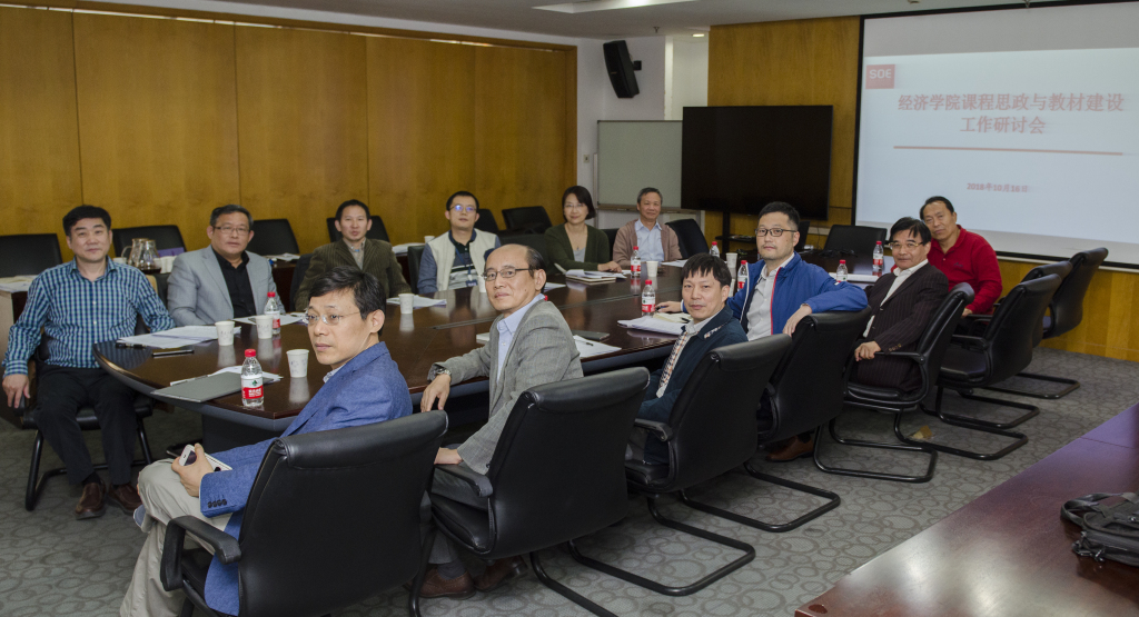课程思政与教材建设工作研讨会。陈钊、陈诗一、程大中、封进、寇宗来、马涛、孟捷、石磊、田素华、汪立鑫、王弟海、尹翔硕等学院领导和专家出席了会议。会议由田素华副院长主持。