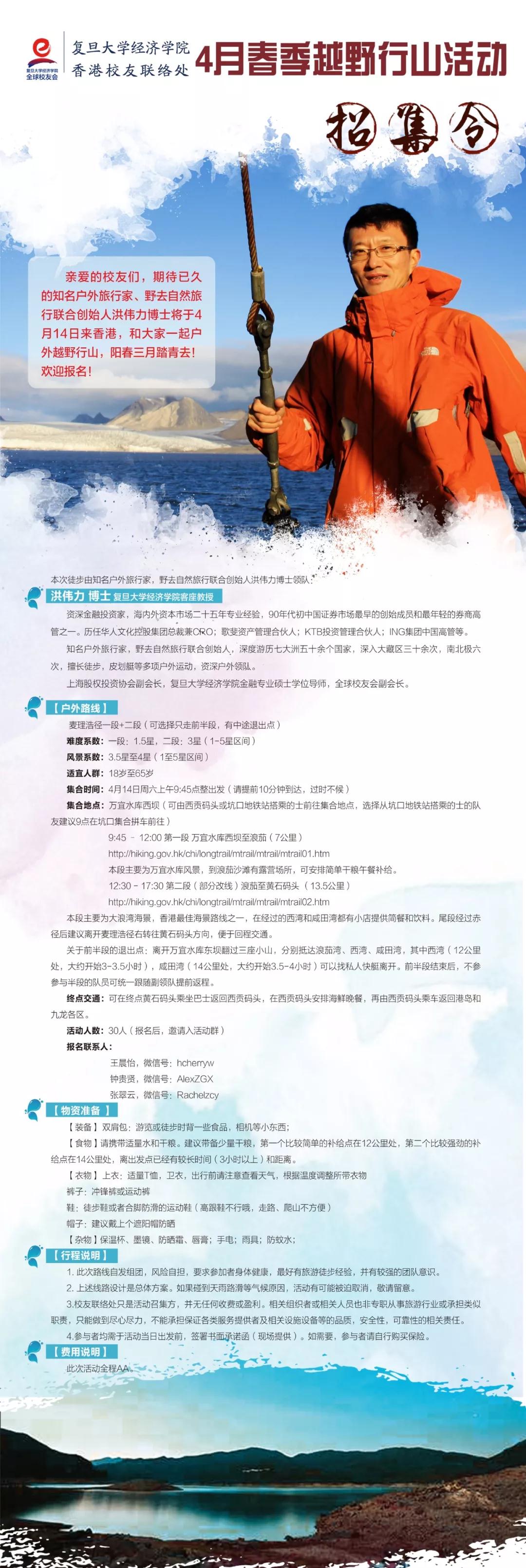 亲爱的校友们,期待已久的知名户外旅行家、野去自然旅行联合创始人洪伟力博士将于4月14日来香港,和大家一起户外越野行山,阳春三月踏青去!欢迎报名!