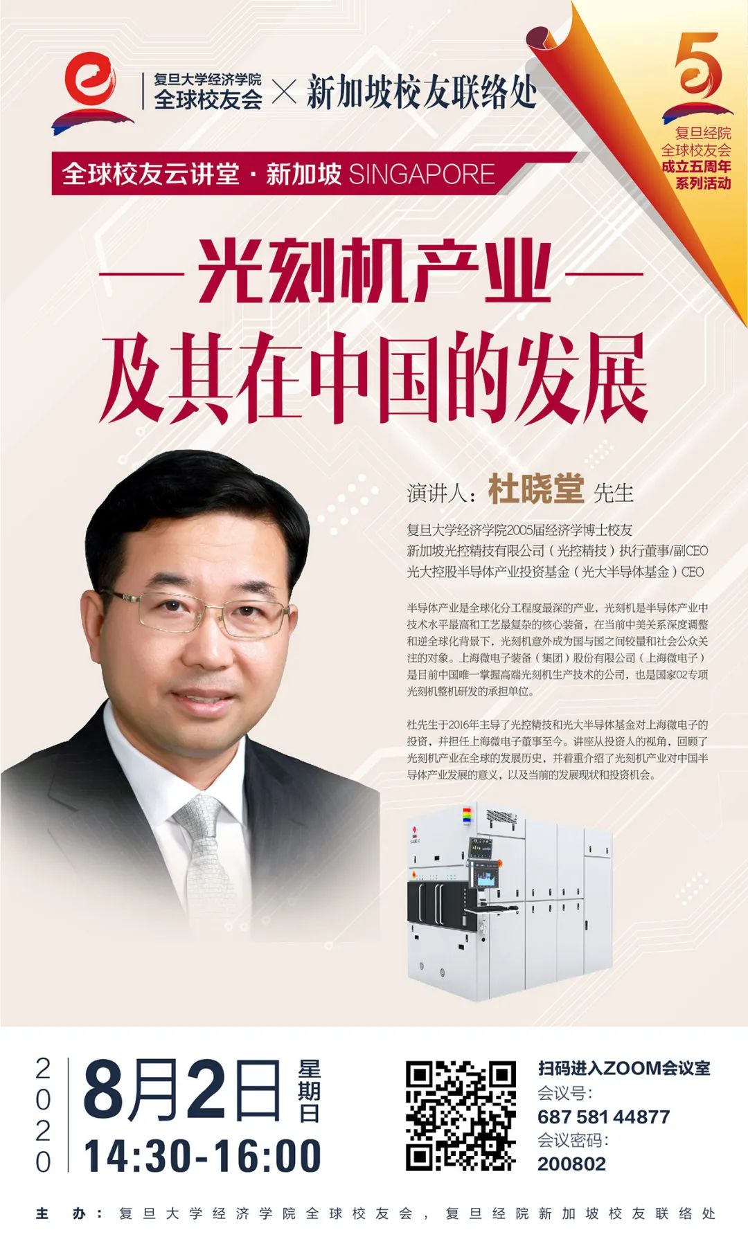 2005届经济学博士校友,现任新加坡光控精技有限公司(光控精技)执行董事/副CEO、光大控股半导体产业投资基金(光大半导体基金)CEO。杜先生于2016年主导了光控精技和光大半导体基金对上海微电子的投资,并担任上海微电子董事至今。讲座从投资人的视角,回顾了光刻机产业在全球的发展历史,并着重介绍了光刻机产业对中国半导体产业发展的意义,以及当前的发展现状和投资机会。
