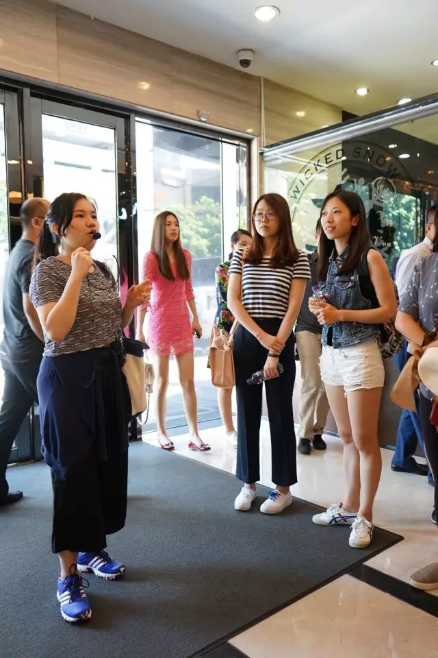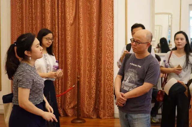下图为梁雅莹耐心为校友讲解剧院历史趣闻。