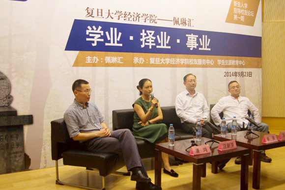 主旨演讲结束后,由潘鸿学长担当主持人,与其他四位学长、学姐进行了一场愉悦而深刻的对话,讲述了一些在求学路上令他们印象深刻的人和事,分析了在学业、事业中成功的必要因素,讨论了学习、考证和实习之间的选择。汪新芽学姐谈到了自己在复旦的学习历程,讲到了自己本科念得是化学专业,但后来因为兴趣的转变而转投到了世经所的门下攻读了博士,强调了复旦自由的学风给了她不断思考可以重新选择人生道路的契机,她也建议广大的学弟学妹们要在复旦这样的自由学府里养成独立思考的能力,自己创造自己的人生。她与学弟学妹分享了自己在学习规划、职业规划以及人生规划过程中,mental(她的师哥)是如何指导和影响她的一些有趣的故事,告诉学弟学妹们,MENTAL(大学生职业生涯规划指导)是非常重要的,这可以引导大学生提高主体性意识、自主选择职业的意识,学会如何正确规划自己今后的职业生涯,这对于他们步入社会和一生的正确发展具有重要的意义。她同时也表态愿意成为学弟学妹的mental,愿意就学弟学妹在大学期间的学习规划、职业规划、爱情规划和生活规划提出建议和帮助。潘鸿学长认为选用人才以德为先,大学生品德教育是非常重要的。还要根据自身素质和性格特点选择适合自己的职业和事业。他还建议学弟学妹在大学期间要把恋爱这一事业规划好。辛强学长则谈到了自己在大学里找到了自己的另一半的浪漫往事,他调侃地说到“我在大学里追过的姑娘就一个,我现在还清晰的记得她的样子,因为我现在每天都能看到她,真的想忘也忘不了。”他建议学弟学妹,要根据自身情况,寻找到最适合自己的道路。在大学期间不能浪费时间,多学些东西,机会总是留给有准备的人的。王雪飞学长分享了自己在寻求学业、谋求职业、开创事业的精彩故事,建议学弟学妹在人生不同阶段做出相应的适合的选择,但是一定要有梦想,而且要坚持梦想。认定了就做,把爱好和工作融为一体是最幸福的。